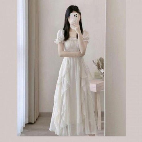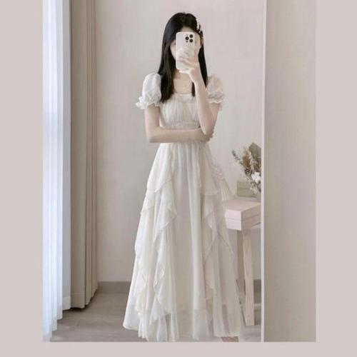 [XBI63I0L]스퀘어넥 퍼프 숄더 흰색 쉬폰 원피스 시스루