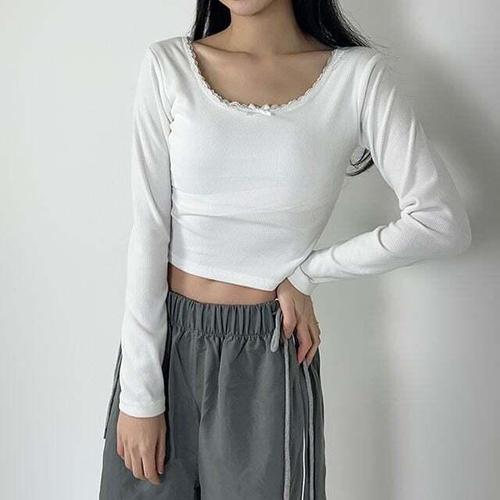 [셀럽하우스]러블리 KDDD7853 화이트 리본 레이스 딥유넥 캡내장 골지 긴팔