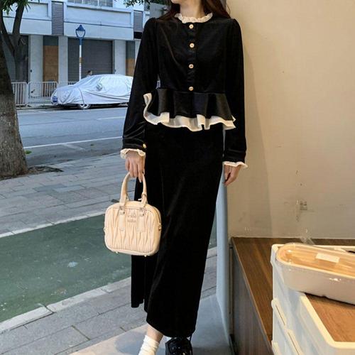 [셀럽하우스]벨벳 HELH3448 투피스 롱 원피스 레이스 프릴 뒷트임