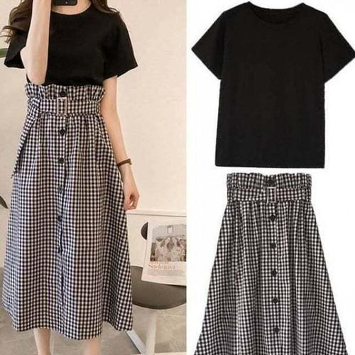 [오너클랜]인기상품 체크 롱 스커트 반팔 투피스 세트 JSC-24062204 [WF66839_250918]