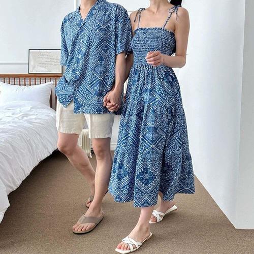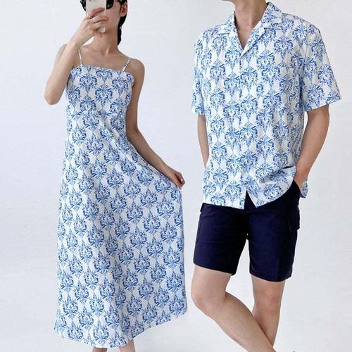 [셀럽하우스]남녀 FPQL7380 블루 커플 비치웨어 휴양지룩 셔츠남방 롱원피스
