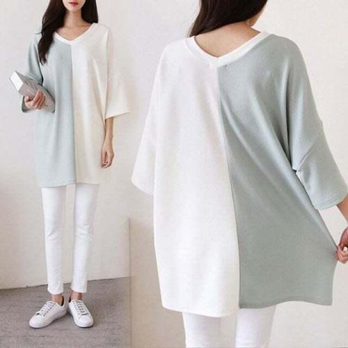 봄가을옷 빅사이즈여성의류 하프 브이넥 5부 롱 박스 티 셔츠 ILC834