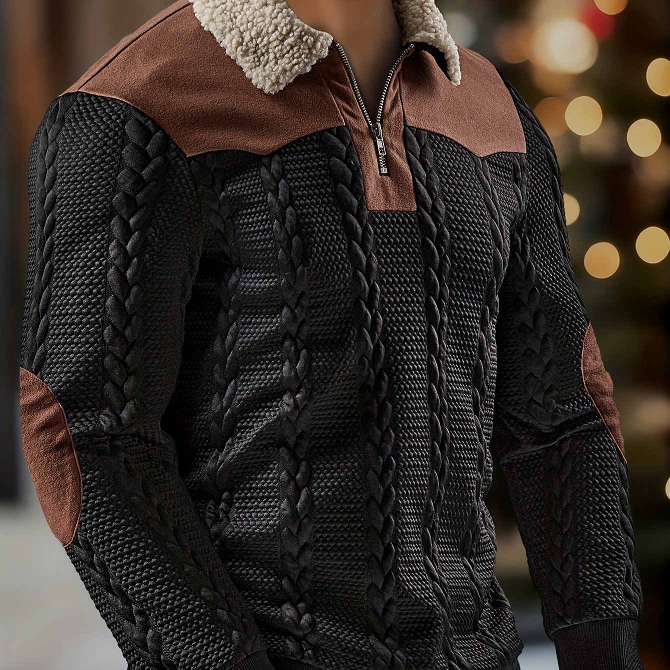 TEMU CLQWE 남성용 풀지퍼 케이블 스웨터 재킷, 플러시 칼라 - 블랙/브라운/베이지 컬러블록, 세탁기 사용 가능 겨울 코트, 야외 및 정장 이벤트용 긴팔 캐주얼 아우터웨어 (레귤러 핏)