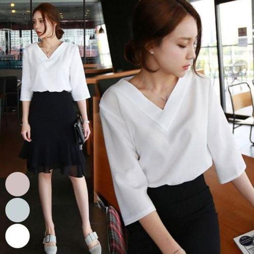 [셀러허브_여성트랜드패션]여자 브이넥 오피스룩 셔츠 7부 티셔츠 v넥 블라우스