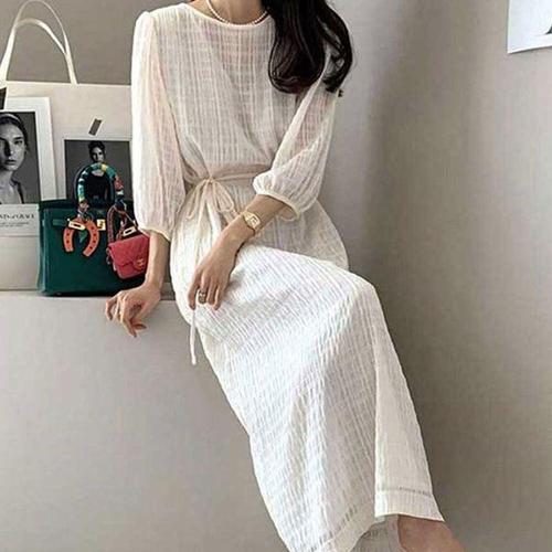 [신상오픈런]여성용 광택 있는 짜임 패턴 7부 소매 롱 원피스
