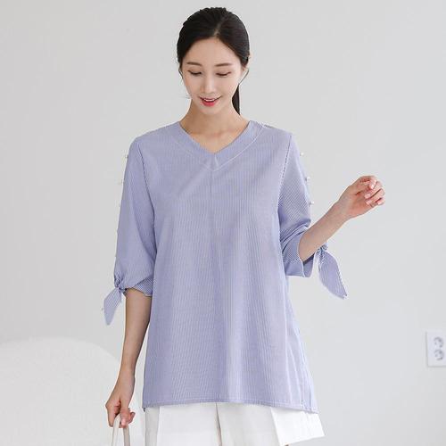 여성 브이넥 스트라이프 진주 리본 7부 롱 블라우스 하객 모임 오피스룩
