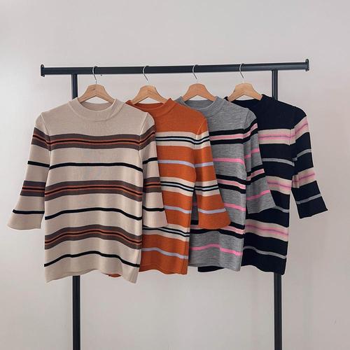 [옷자락] 여자 모크넥 배색 스트라이프 칠부 루즈핏 가을 니트