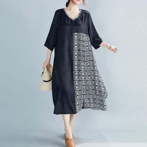 AOKADA 1+1중년 여성 여름 반팔 오버핏 7부 소매 프린팅 롱 원피스