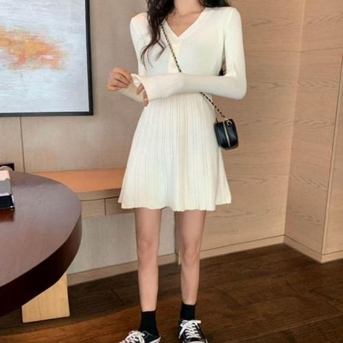 [엄지척]여자 V넥 가디건 A라인 플리츠 니트 원피스 일체형_19910106_667501
