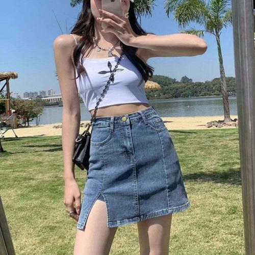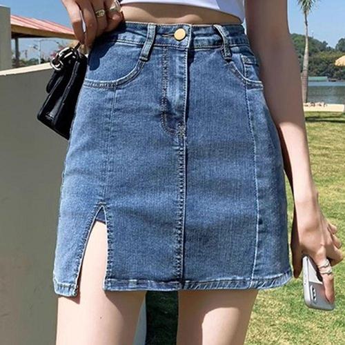 [셀럽하우스]여성 QYTQ6330 A라인 데이트룩 데님 하이웨이스트 슬릿 청치마
