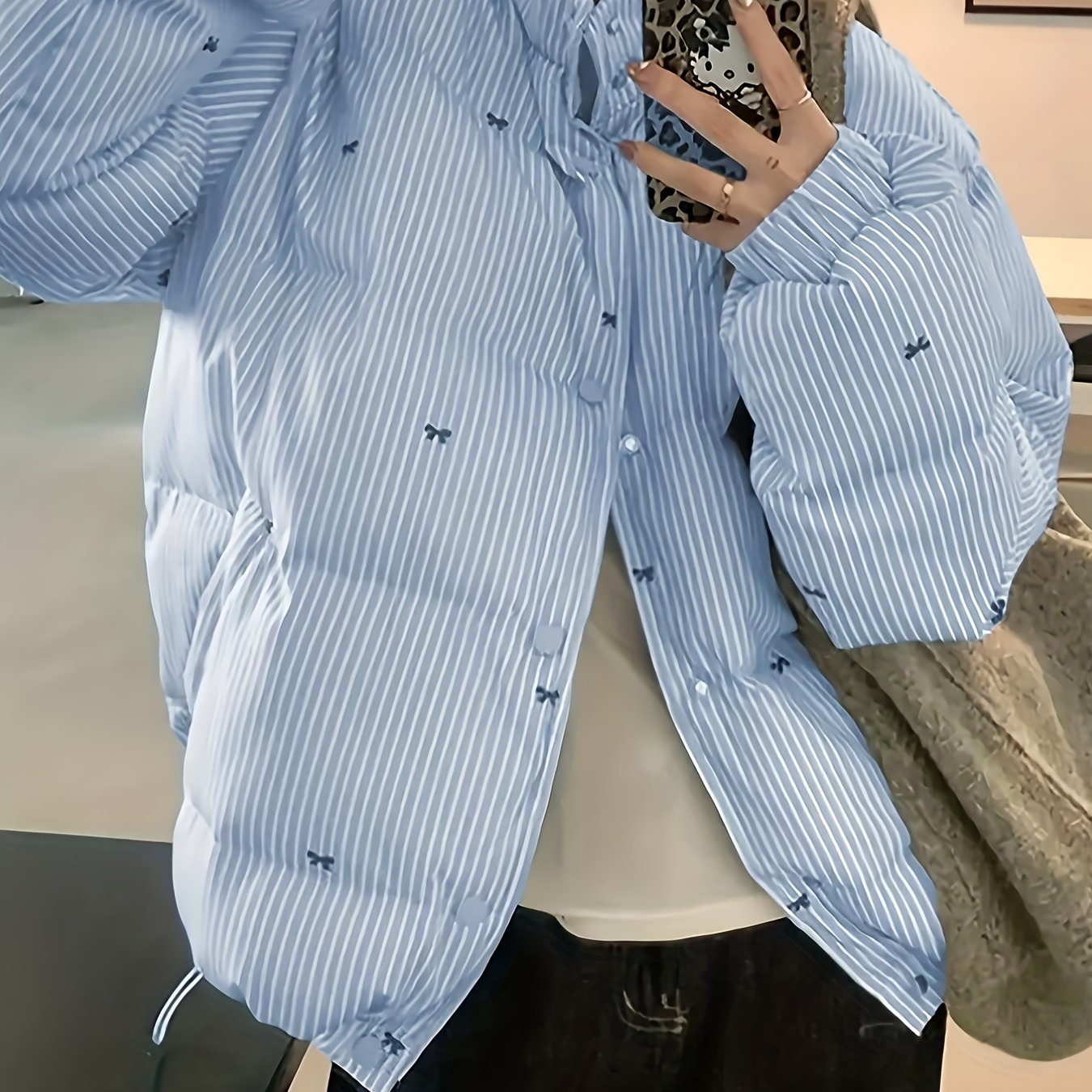 TEMU 여성용 겨울 따뜻한 재킷 코트 - 우아한 스타일 블루 & 화이트 수직 , 오버사이즈 루즈핏, 버튼 프론트 클로저, 세탁기 사용 가능한 코트 (캐주얼 & 프로페셔널 아우터웨어)