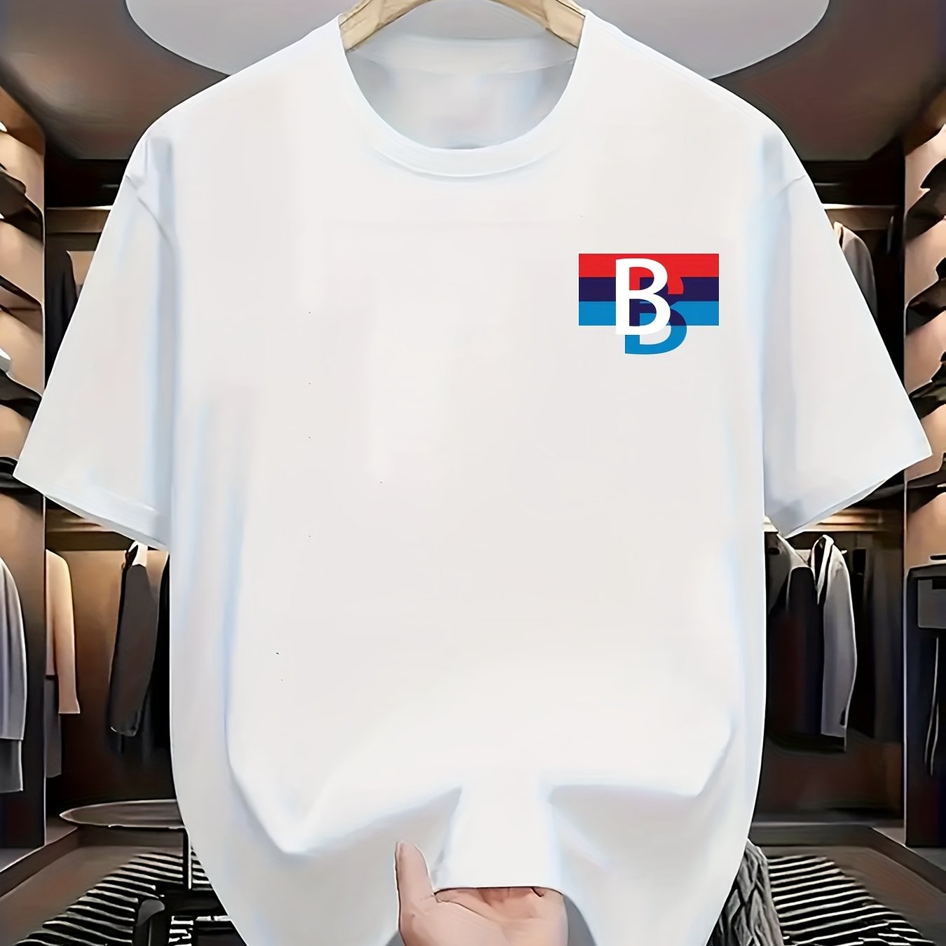 TEMU 남성용 3D 프린트 반팔 티셔츠 - B 패턴 디자인, 라운드 넥, 가벼운 폴리에스테르, 기계 세척 가능, 모든 계절에 편안한 핏, 캐주얼 스타일, 일상 티셔츠 | 강력한 그래픽 티 | 가벼운 소재