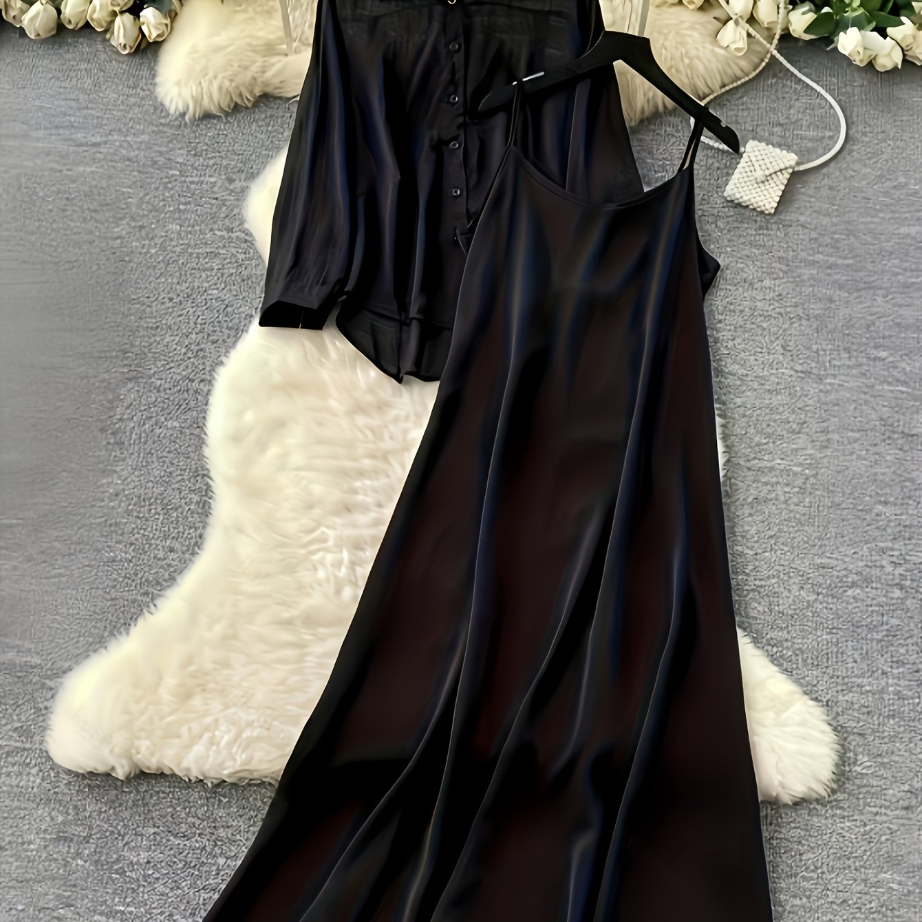 TEMU 2025 신상 롱슬리브 턴칼라 셔츠 + 루즈핏 스파게티 멜빵 드레스, 캐주얼 아웃핏,데일리 패션,우아한 스타일,신축성 없는 원단,맞춤형 디자인,모던 드레서,여성 패션