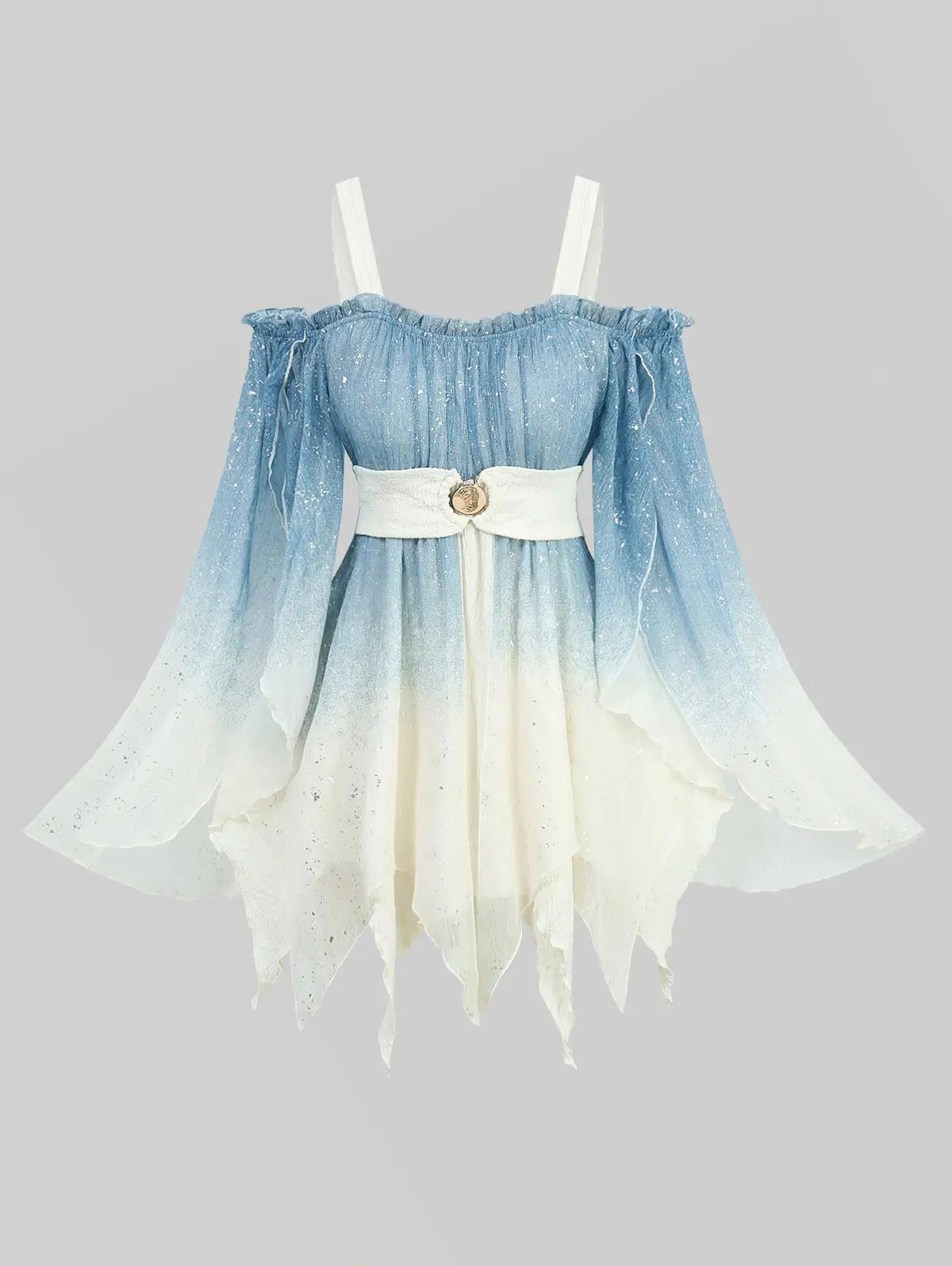로즈갈 플러스 사이즈 옴브레 프린트 콜드 숄더 블라우스 플레어 슬리브 비대칭 탑 여성용 2025 가을 신상 핫 스탬핑 디테일