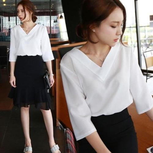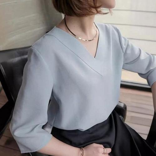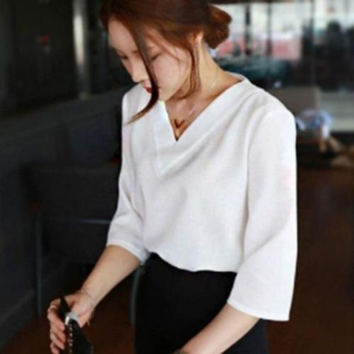 [엄지척]여성 브이넥 여름 외출 패션 깔끔한 7부 블라우스_19644992_667501
