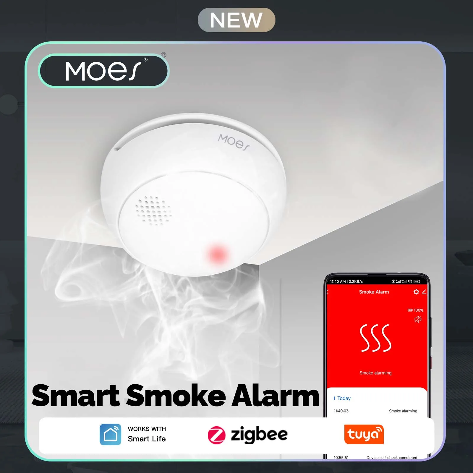 MOES ZigBee 연기 감지기, 85dB 소리가 나는 무선 화재 및 연기 경보기, 가정 주방 안전 보호를 위한 스마트 앱 경고 센서