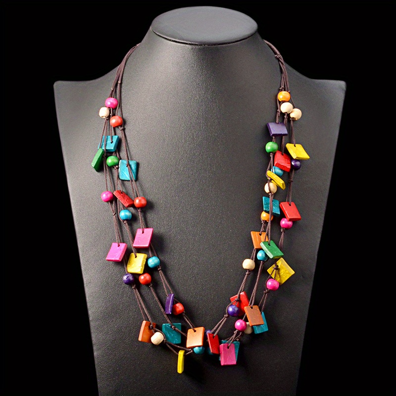 TEMU 수제 다층 광장 나무 쌀 구슬 목걸이, boho 스타일 목 보석 민족 스타일 여성 목걸이 여름 해변 액세서리