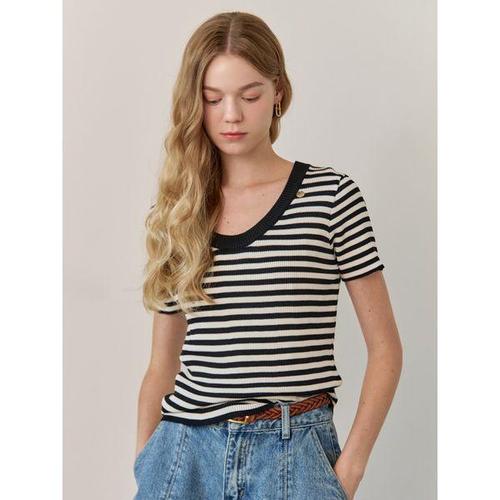 [마쟈]스트라이프 패턴 U넥 반팔 니트(제트블랙)