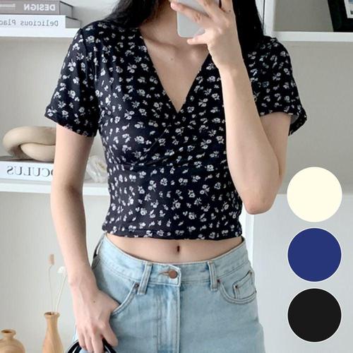 티셔츠 꽃무늬패턴 크롭티 슬림핏 반팔티 브이넥