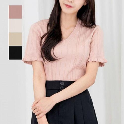 여성 여름철 시원한 쿨 니트 소재 브이넥 반팔티