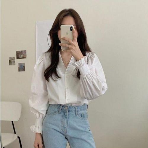 여성 브이넥 단춘포인트 남방 셔츠 블라우스 DJJ8086 실크 정장 오피스 오피스룩 가을 여자