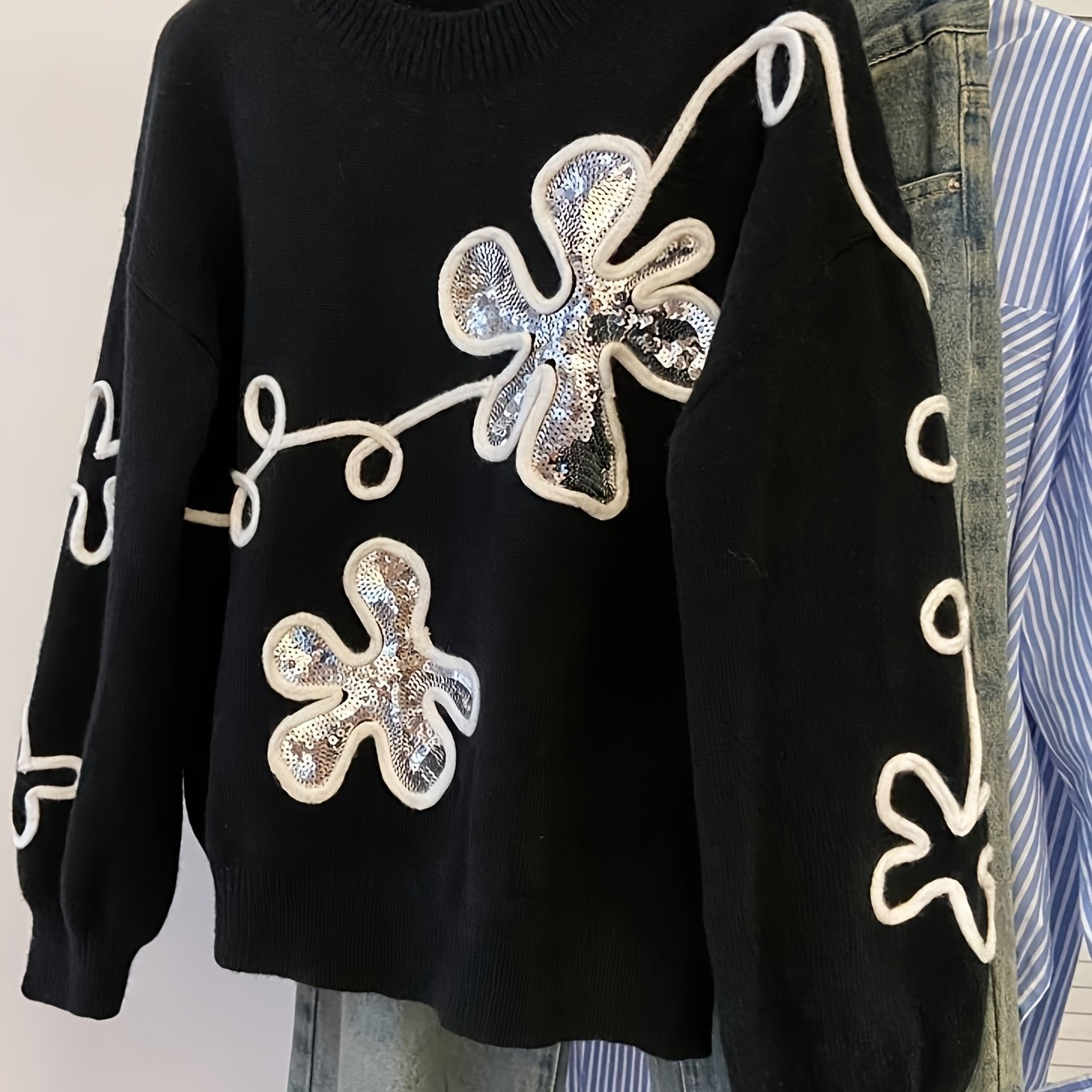 TEMU 여성용 가을 겨울 시즌 화려한 데이지 자수 편안한 루즈핏 캐주얼 크루넥 풀오버 스웨터 - 대비 컬러 올매치 스웨터, 루즈핏 스웨터, 부드러운 질감
