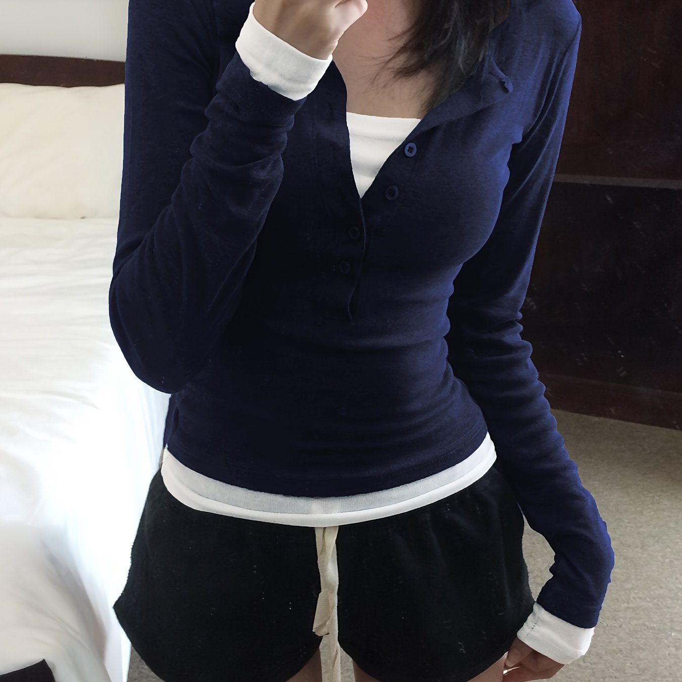 TEMU 피어 데자이어 스타일의 기본적인 투피스 티셔츠, Y2K 컬러 블록 디자인과 가을/겨울용 버튼 디테일이 특징입니다.|티셔츠