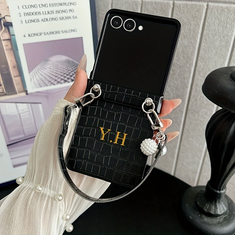 TEMU 검은색과 흰색 하운드투스 접이식 폰 케이스 진주 체인 삼성 갤럭시 Z 플립 6 귀여운 여자 접이식 폰 케이스