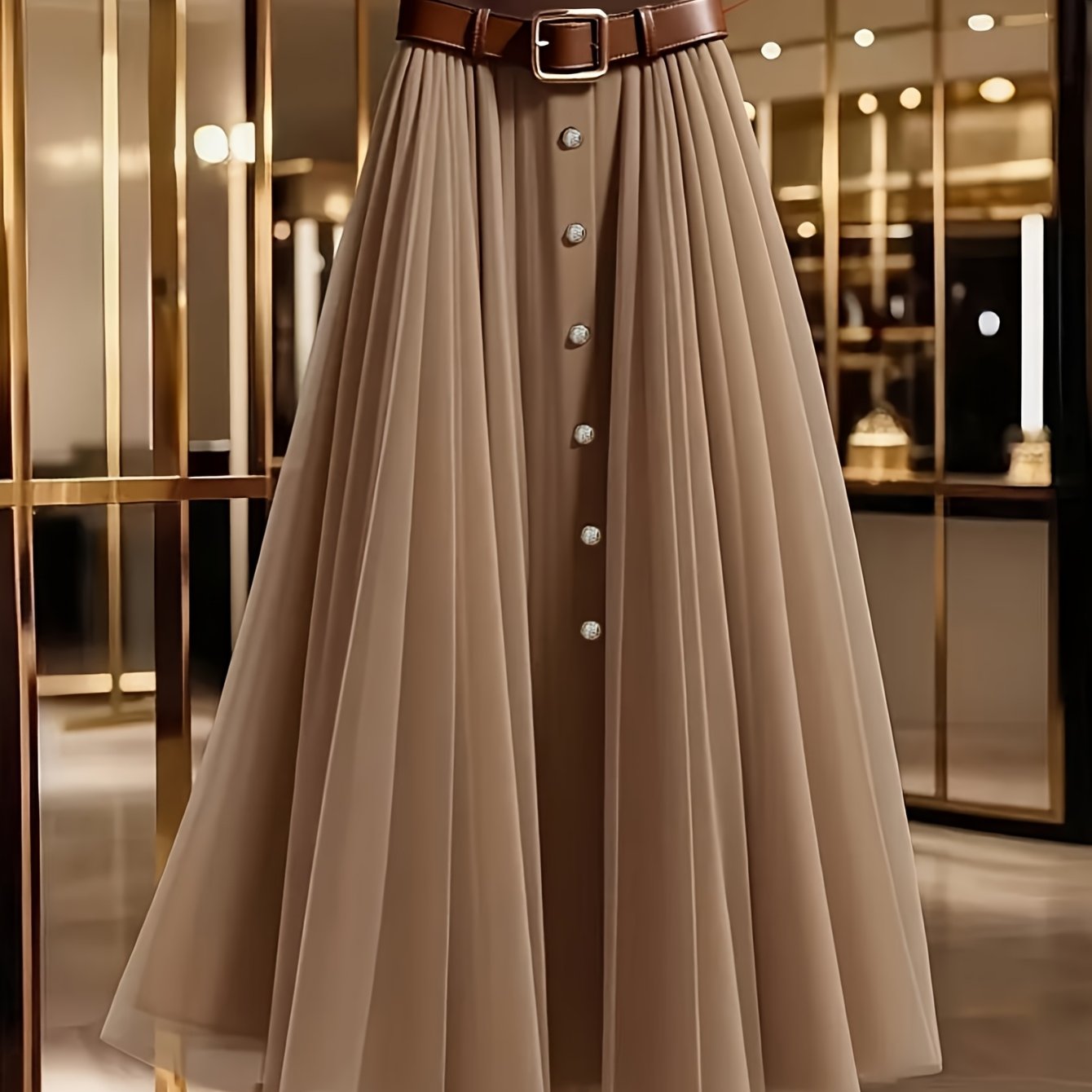 TEMU 여성용 봄/가을 우아한 솔리드 컬러 메쉬 패치워크 싱글버튼 장식 캐주얼 출근용 하이웨이스트 플리츠 스커트, 벨트 미포함